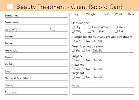 Beauty Client Record Card Pack Of 100