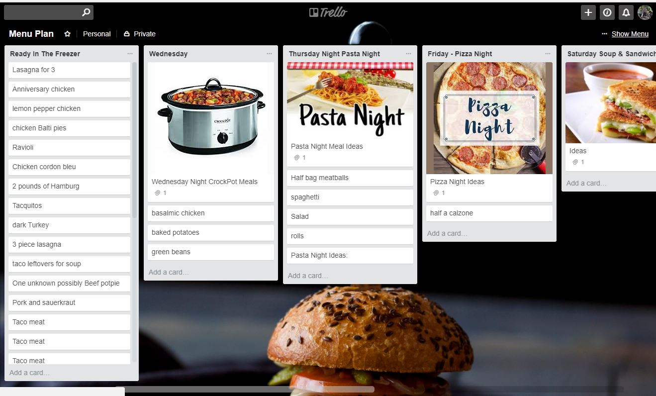Trello meal planning template. Create lists for different categories of meals seafoo. Personally i use trello for recipes and meal planning as my weekly planner and as an editorial calendar for my blog. Ive titled mine family meal plan and chose a foodie type background i likedfor backgrounds they have solid colors and some really nice stock images to choose from. Workflows include vacation planning home renovation household.